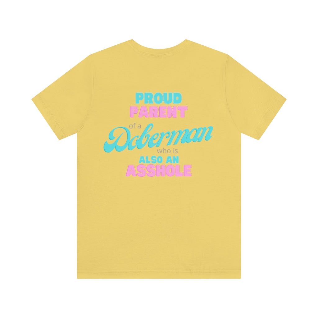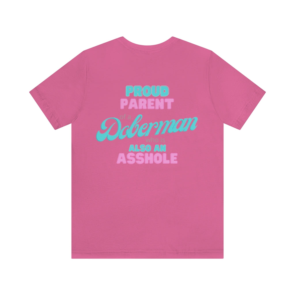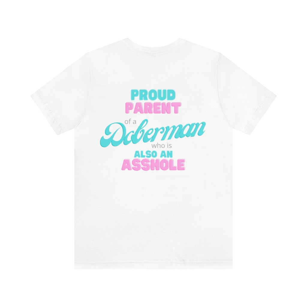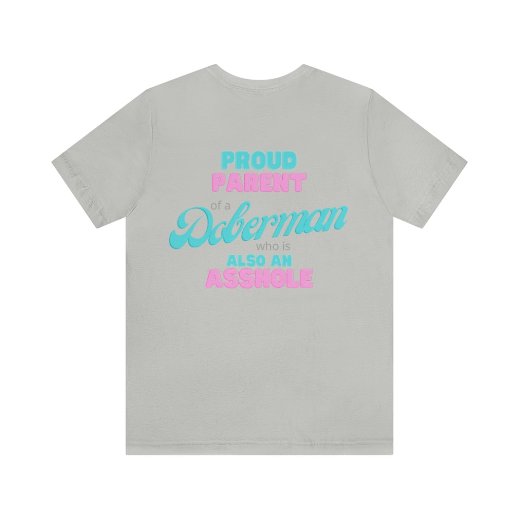 Our Proud Parent of a Doberman Who Is An Asshole graphic printed on the Back (also available in front graphic, crewneck sweatshirt, tote bag and mugs).