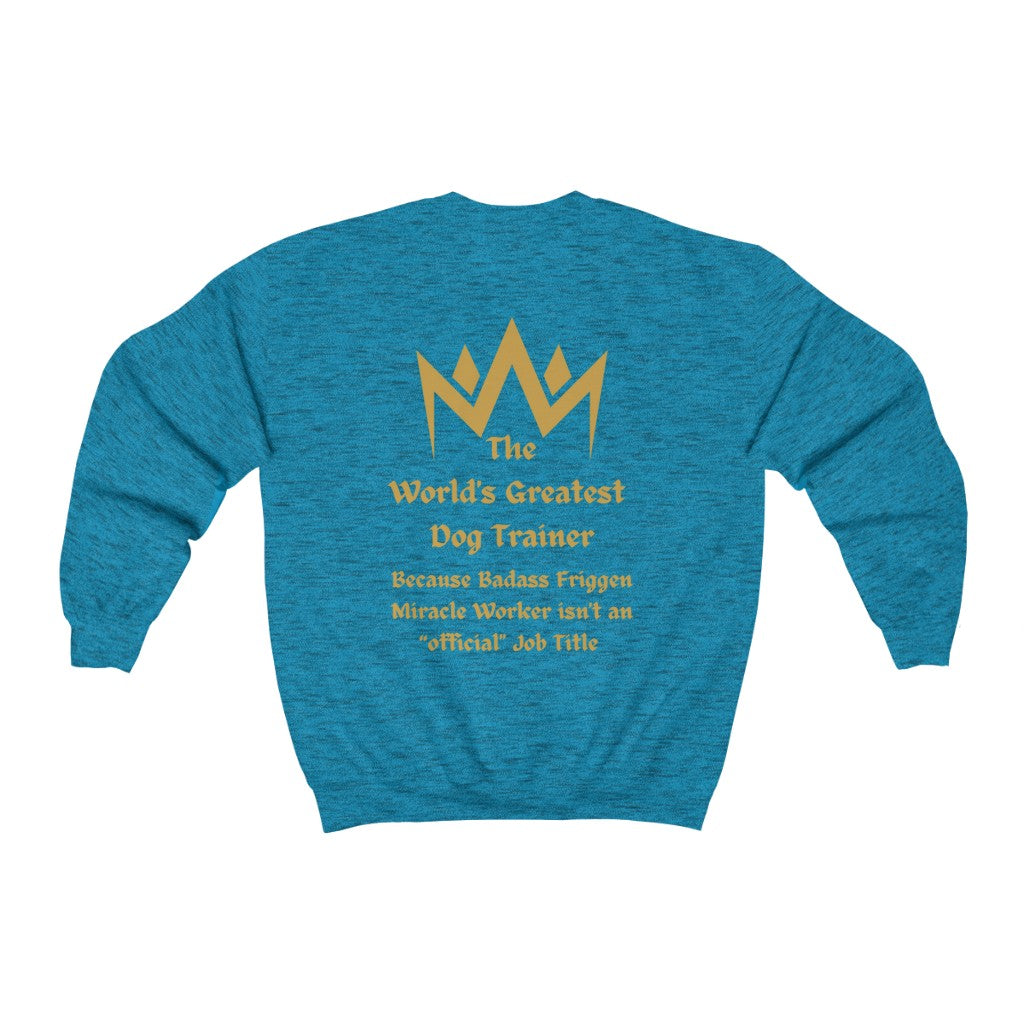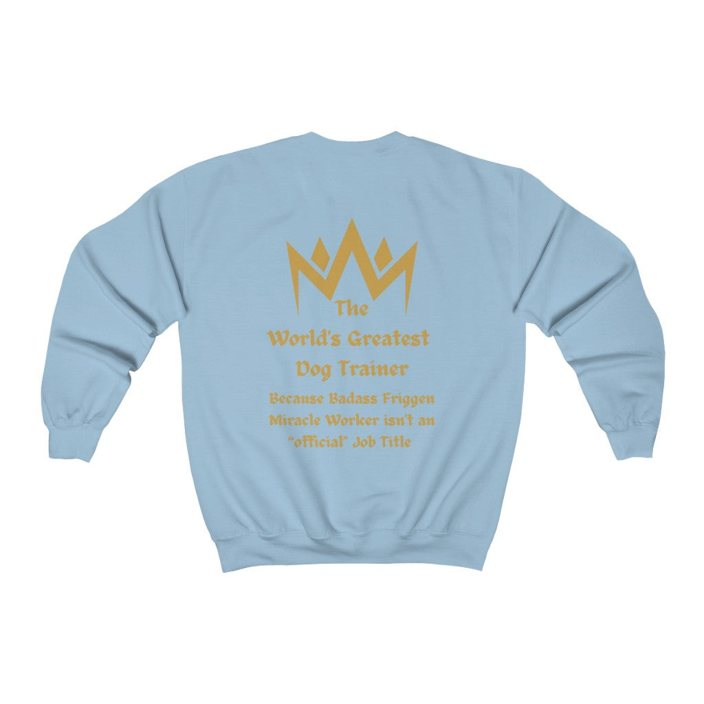 Our World's Greatest Dog Trainer graphic sweatshirt features gold lettering and crest on the Back Only.