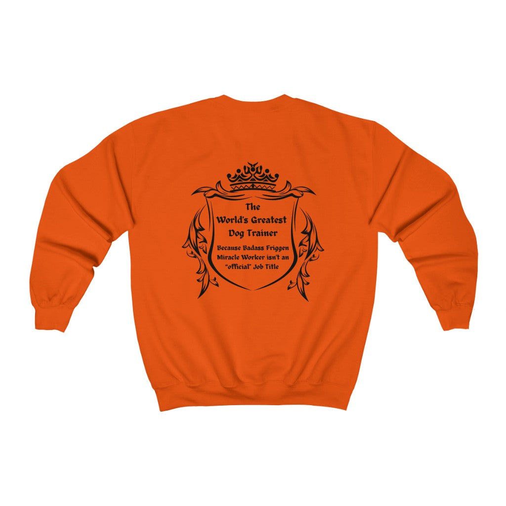 Our World's Greatest Dog Trainer graphic sweatshirt features black lettering and crest on the Back Only.
