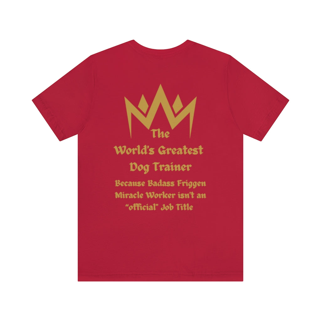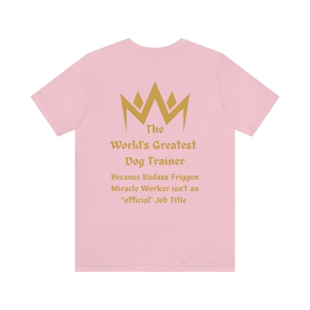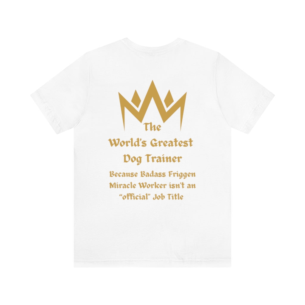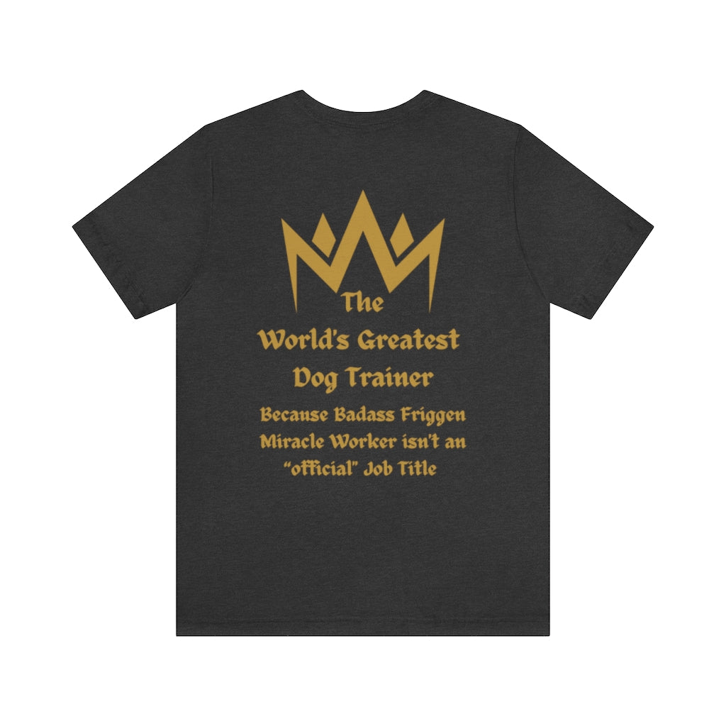 Our Worlds Greatest Dog Trainer gold graphic is featured on the back of our Bella Canvas Unisex Tee.