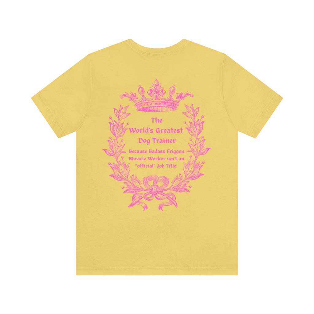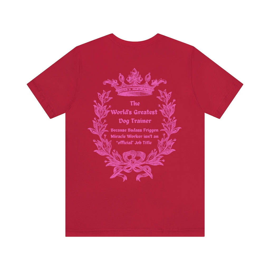 Our Worlds Greatest Dog Trainer graphic is featured on the back of our Bella Canvas Unisex Tee.